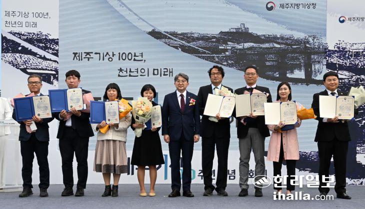 28일 열린 제주기상 100주년 기념 문화제에서 기상업무발전에 이바지한 유공자들이 표창을 받고 기념촬영을 하고 있다. 이상국기자