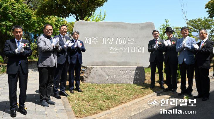 28일 제주지방기상청에서 열린 제주기상100주년 기념식에서 기념비 제막식이 진행되고 있다. 이상국기자