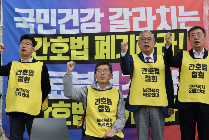 2일 오전 서울 용산구 대한의사협회 앞에서 열린 간호법 저지를 위한 13개 단체 보건복지의료연대 투쟁 로드맵 발표에서 참가자들이 구호를 외치고 있다. 연합뉴스