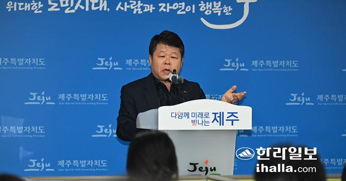 변덕승 제주도 관광교류국장이 15일 제주도청 기자실에서 입장문을 발표하고 있다. 이상국기자