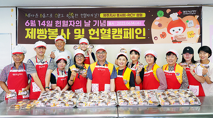 대한적십자사 제주특별자치도혈액원(원장 김영섭)은 지난 14일 헌혈자의 날을 기념해 대한적십자사 제주지사(회장 정태근) 소속 봉사원 및 RCY단원들과 함께 제빵봉사 및 헌혈캠페인을 실시했다.