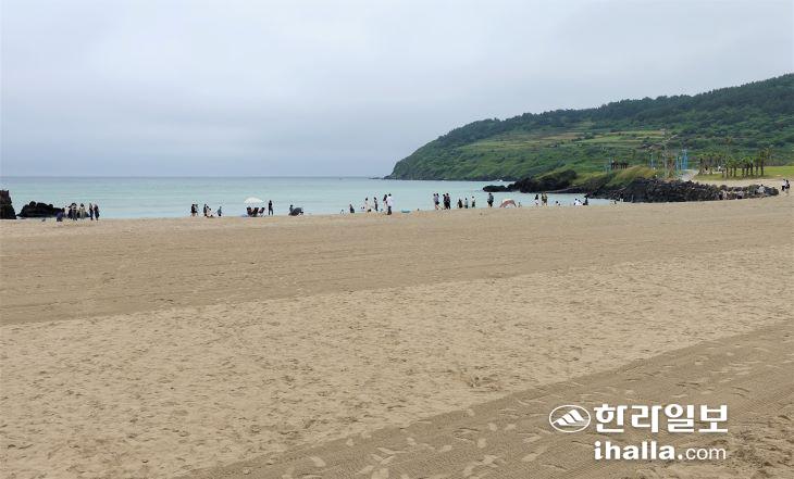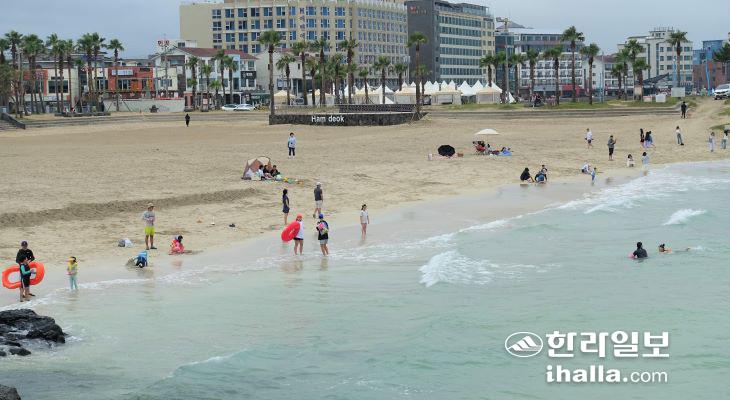 21일 제주시 조천읍 함덕해수욕장을 찾은 방문객들이 흐린 날씨 속에 물놀이 등을 즐기고 있다.