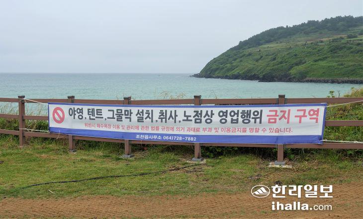 함덕해수욕장 일대에 게시된 불법행위 금지 안내 현수막.