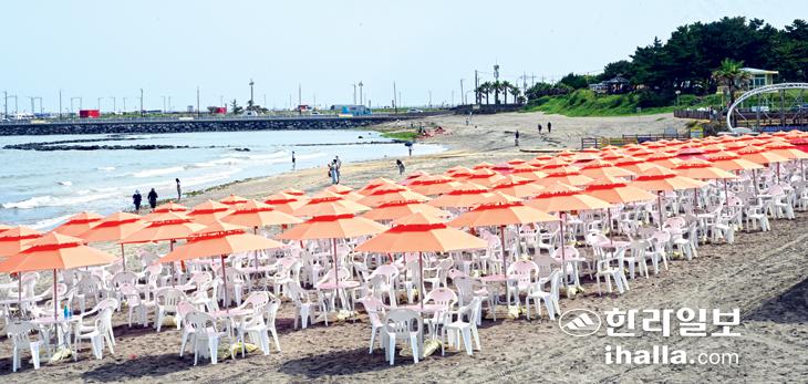 제주시 이호테우해수욕장 조기 개장일을 이틀 앞둔 22일, 모래사장에 파라솔이 설치돼 있다. 이상국기자