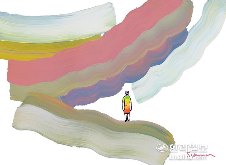 해 질 무렵 이층집 옥상에서 하늘을 봅니다. 쪽빛과 옥빛과 다홍은 하늘이라는 추상적인 대상의 색깔로써 지금 현현(玄玄)합니다. 그리고 "부드럽고 따스한 손을 뻗어" 지상의 저녁에 흔들리는 존재의 어깨를 붙들어주며 현실에 개입하면서 "지상에서 가장 아름다운 오 분"이 됩니다. 그러나 그 하늘은 아쉽게도 지금은 없는 하늘이어서 이곳에 없으면 다른 곳에 있다는 뜻인데, 이미 없는 것이 삶의 편에 서 있으려면 기억과 연결되어야 하지요. 그 하늘이 모습을 낮추면 물이 되어 지상에 스미고, 내 안의 '오 분' 속에 영생으로 살아집니다. 어떤 의미를 그리기 전에 사라질 수 있는 다홍을 나와 하늘의 접점에 두고 자신을 감각하는 화자의 모습은 이층집 옥상에서 외롭지만 고유하고, 반대편에서 아름다운 기억을 잃어버린 세계가 밤처럼 깔리는 것 또한 볼 수 있을 테지요. 어쩜, 진정한 존재의 축복이란 그럴 때 가능한 것이겠고요. <시인>