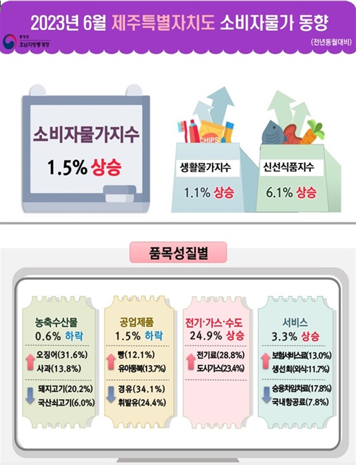 4일 호남지방통계청 제주사무소의 '6월 제주자치도 소비자물가동향'에 따르면 지난달 도내 소비자물가는 작년 동월 대비 1.5% 올랐다. 1%대 물가 상승률은 2021년 3월(1.8%) 이후 2년 3개월만이다. 또 지난달 전국평균 물가 상승률(2.7%)을 밑돌며 17개 시·도 가운데 가장 낮게 나타났다.