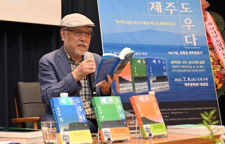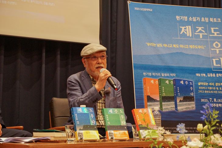 [한라일보] '순이 삼촌'으로 제주4·3의 비극을 널리 알린 현기영(82) 소설가가 일제강점기부터 4·3에 이르기까지 제주도 근현대사를 총체적으로 다룬 장편소설 '제주도우다'(창비 펴냄)를 들고 도내 독자들과 만났다.