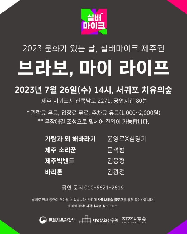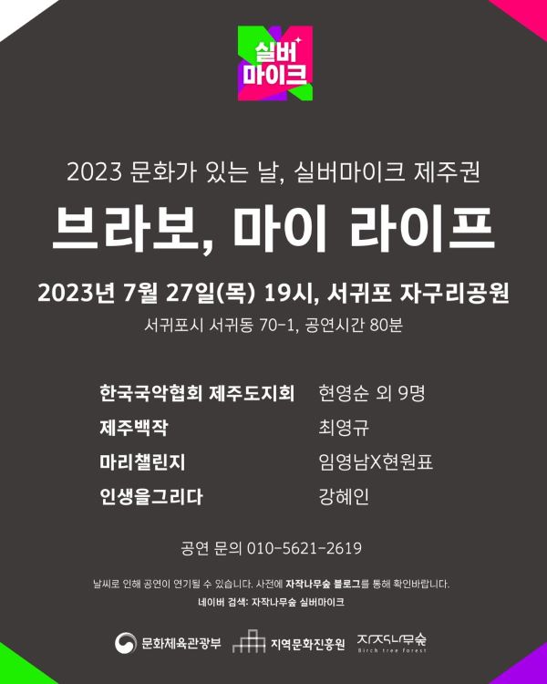 한편 자작나무숲이 주관단체로 진행하고 있는 2023 문화가 있는 날 '실버마이크 제주권-브라보 마이 라이프'는 매달 마지막 수요일 문화가 있는 날 프로그램의 일환에서 제주에서는 올해 처음 이뤄지고 있다.