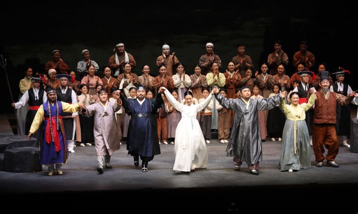 지난 21일 제주아트센터 대극장 무대에서 정식 초연된 창작오페라 '홍윤애'. 공연이 끝난 후 출연진들이 무대 인사를 하고 있다. 제주특별자치도 제공