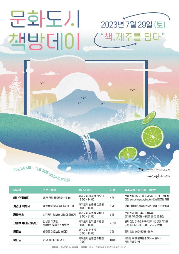 이달 29일엔 서귀포 동네책방들의 2023년 '문화도시 책방데이'가 서귀포 동네책방 6곳(키라네 책부엌, 그림책카페 노란우산, 인터뷰책방, 어나더페이지, 라바북스, 북타임)에서 진행된다. 특히 이달엔 작가와 함께 하는 프로그램(청귤 칵테일 만들기, 북토크, 글쓰기의 기초 배워보기 등)이 다양하게 준비됐다.