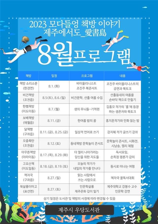 제주시 우당도서관의 모다들엉 책방 이야기 '제주에서도-愛書島' 8월 프로그램으로, 예술 공연과 북토크, 인문학 강연, 체험프로그램 등 책과 함께 한여름의 무더위를 식혀줄 다양한 프로그램들이 준비됐다. 자세한 내용 확인 및 참여 신청은 '책섬, 제주'홈페이지 또는 각 책방 인스타그램 계정을 통해 할 수 있다.