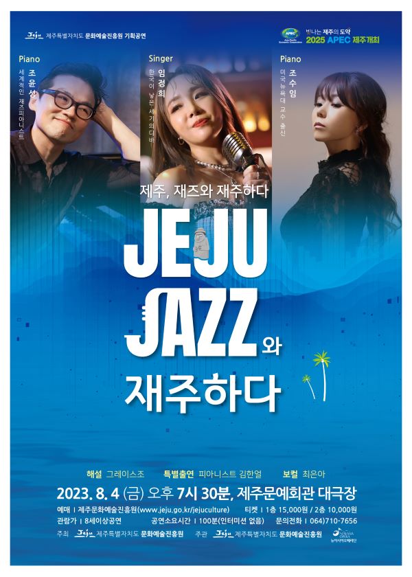 4일 '제주, 재즈(JAZZ)와 재주하다' 공연엔 세계적인 재즈 피아니스트 조윤성과 명품 보컬리스트 임정희, 뉴욕대 교수 출신으로 활발하게 활동하는 재즈피아니스트 조수임이 함께 한다. 제주 출신 재즈피아니스트 김한얼과 재즈가수 최은아가 특별출연해 풍성함을 더하는 이날 무대는 클래식 레파토리와 재즈 스탠다드 명곡을 비롯 라틴 재즈 등 다채롭게 펼쳐질 예정이다. 재즈를 알기 쉽게 설명하고 관객과 소통하기 위해 뉴아시아오페라단 그레이스조 단장이 해설을 맡아 진행한다.