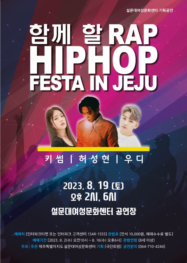 제주도 설문대여성문화센터는 8월 19일 2회(오후 2·6시)에 걸쳐 청소년을 위한 기획공연 '함께할 랩-힙합 페스타 인(Rap-hiphop festa in) 제주'를 연다. 이날 공연엔 힙합 뮤지션 허성현, 우디, 키썸이 출연한다. 관람료는 전석 1만원이며 티켓 예매(8월 2~16일)는 인터파크 티켓 등에서 가능하다.