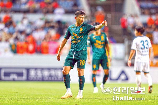 지난 6일 제주월드컵경기장에서 열린 강원FC전 득점 후 환호하는 헤이스의 모습.