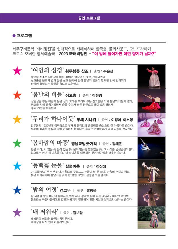 '新 배비장전'은 현대의 공무원 배 아무개 씨가 과거의 제주도로 회귀하며 본격적인 이야기가 시작된다. "새로 부임한 배비장을 위해 애랑이를 중심으로 전국에서 전설적인 예기(藝妓)들이 한데 모인다"는 설정으로 다채로운 한국 춤이 펼쳐진다.