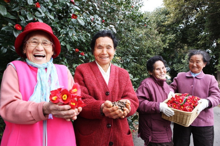 동백꽃과 동백열매를 들고 있는 제주 서귀포시 신흥2리 어르신들. 연합뉴스