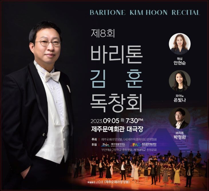 9월 5일엔 바리톤 김훈이 풍성한 울림을 전한다. 여덟 번째 독창회 무대로, J.O.E(제주오페라앙상블)와의 협업으로 오페라 특유의 웅장함과 화려한 합창사운드를 관객들에게 선사할 예정이다. 이날엔 바리톤 박정환이 특별출연으로, 피아니스트 은빛나가 반주로, 안현순 작곡가가 해설로 함께 한다. 전석 무료.