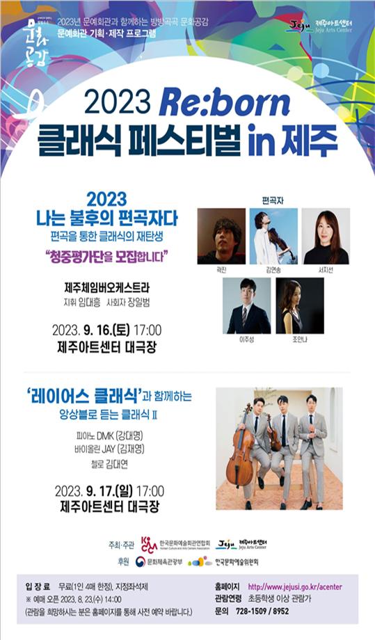 제주아트센터는 '2023 Re:born 클래식 페스티벌 in 제주'의 일환으로 9월 16일(오후 5시) 클래식 음악의 색다른 편곡으로 관객들의 흥미를 유도하는 '나는 불후의 편곡자다'에 이어 17일(오후 5시) '레이어스 클래식과 함께하는 앙상블로 듣는 클래식'공연을 개최한다. 어린이부터 성인까지 누구나 즐길 수 있도록 구성된 공연들이다. 관람료는 무료며, 아트센터 홈페이지에서 예약(1인 4매)할 수 있다.