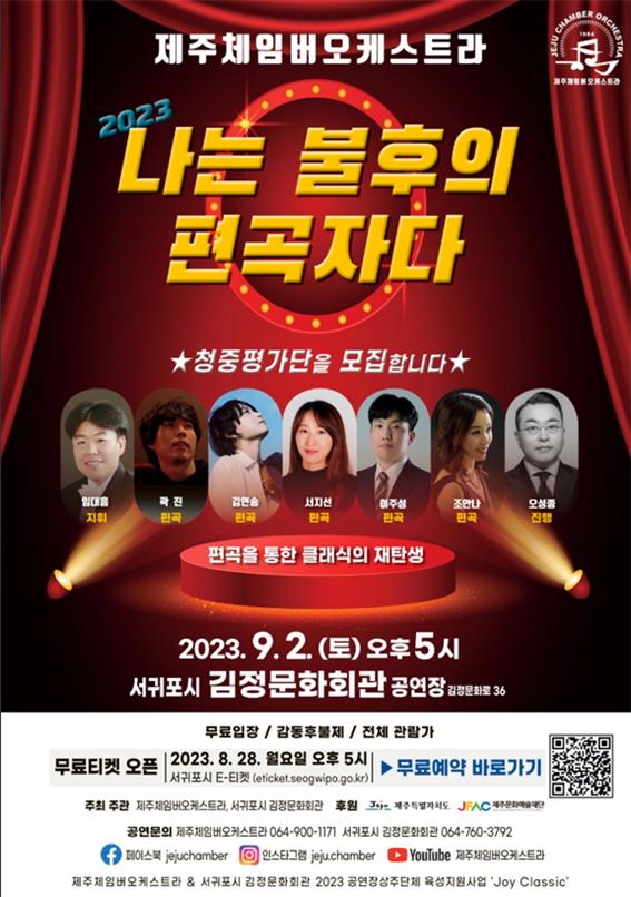 관객이 청중평가단이 되어 투표로 평가하는 TV쇼 형식으로 진행되는 '나는 불후의 편곡자다'는 서귀포시 김정문화회관(9월 2일 오후 5시)에서도 만날 수 있다. 이날 관객들은 곽진, 김연송, 서지선, 이주성, 조안나 편곡자가 편곡한 곡을 제주체임버오크세트라의 연주로 만나게 된다. 무료 공연이며, 입장권은 서귀포시 E-티켓을 통해 예약(선착순 330명)할 수 있다.