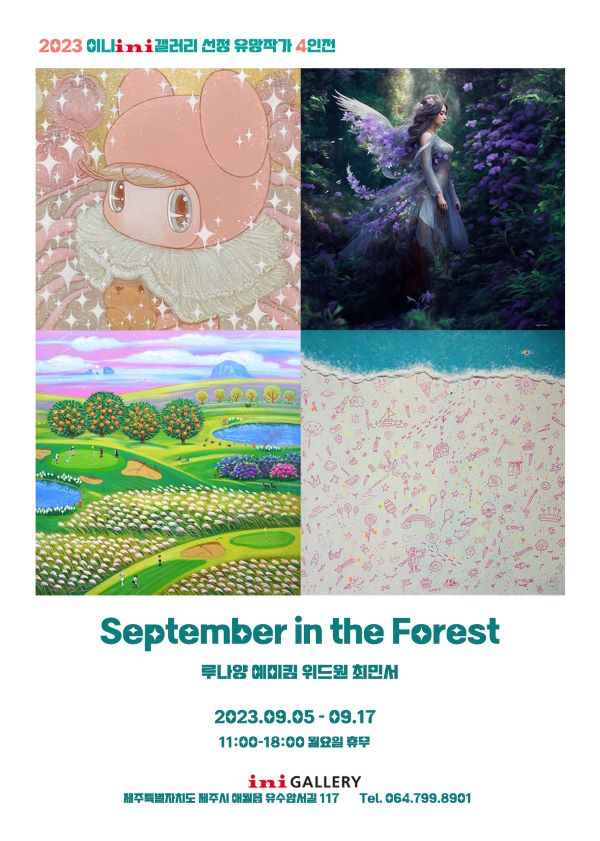 ▶이니갤러리 선정 유망작가 4인전=애월 유수암 숲속에 위치한 이니갤러리에서 2023년 선정 유망작가 4인전 'September in the forest'가 열리고 있다. 작가들의 끝없는 상상력을 통해 숲은 활기찬 캔버스로 변신하고, 갤러리 안에서는 현실과 판타지의 경계가 흐려진다.