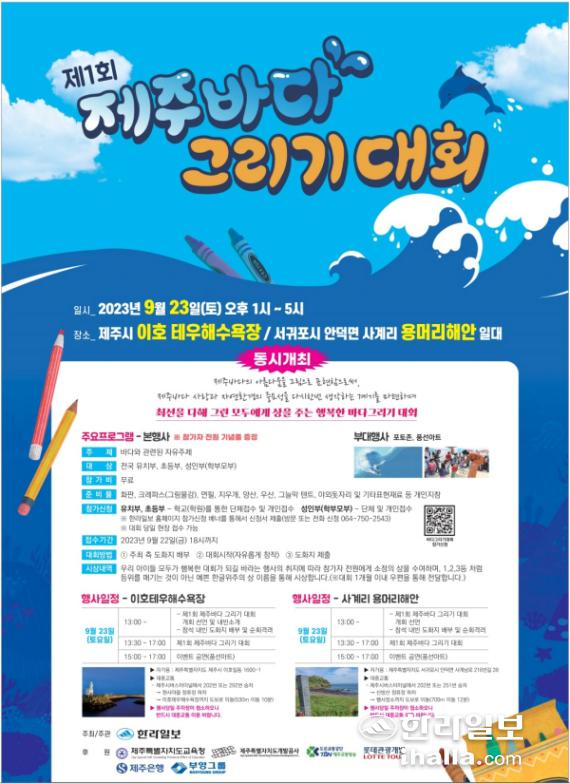 한라일보는 오는 23일 오후 1~5시 제주시 이호테우해수욕장과 서귀포시 안덕면 사계리 용머리해안 일대에서 '제1회 제주바다 그리기 대회'를 개최한다. 제주도교육청과 제주도개발공사, 도로교통공단 TBN 제주교통방송, 롯데관광개발, 제주은행, 부영그룹이 후원하는 행사다.