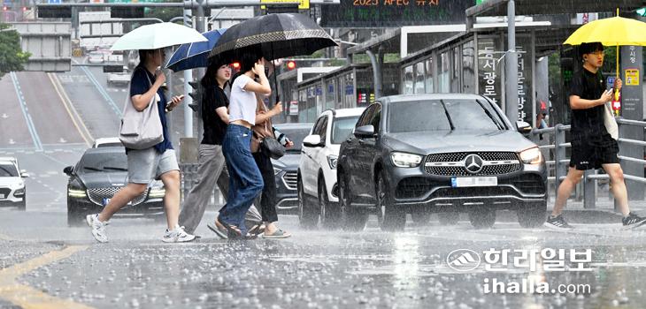 우산 쓰고 걸어가는 시민들. 한라일보 DB