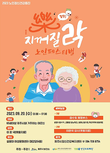 제주시정신건강복지센터(센터장 강지언)는 20일 설문대여성문화센터 4층 대강당에서 '2023 노인정신건강 페스티벌 - 지꺼질 樂(락)'을 개최한다.