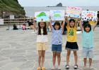 제주시 이호테우해수욕장과 서귀포시 안덕면 사계리 용머리 해안 일대에서 진행된 제1회 제주바다그리기 대회 참가자들이 완성한 그림을 들고 포즈를 취하고 있다.