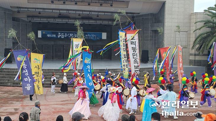 비 날씨로 산지천 북수구광장에 조성된 마사토 경연장을 사용하지 못하게 돼 8~9일 예정된 민속예술축제와 탐라퍼포먼스가 탑동해변공연장으로 장소를 옮겨 펼쳐졌다. 제주예총 제공