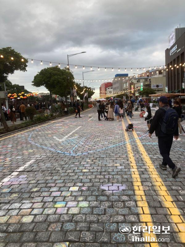 지난 7일부터 9일 동문로터리부터 용진교까지 조성된 '차 없는 거리'에서 펼쳐진 탐라나장에서 바닥 그림그리기를 즐기고 있는 방문객들. 제주예총 제공
