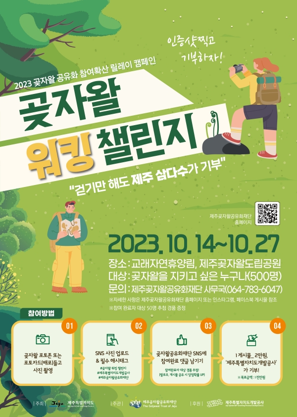미션은 곶자왈을 걸으며 포토존 또는 포토카드를 들고 찍은 사진을 개인 SNS에 홍보 해시태그와 함께 실으면 참여할 수 있다. 이후 제주곶자왈공유화재단 인스타그램 등 행사 안내 페이지에 참여 완료 댓글을 달아야 한다. 게시물 1건당 2만원씩 기부되며, 행사가 끝난 뒤 50명을 추첨해 경품이 지급된다. 자세한 사항은 제주곶자왈공유화재단 홈페이지(www.jejutrust.net)와 사무국(전화 070-4543-2372)을 통해 확인할 수 있다.