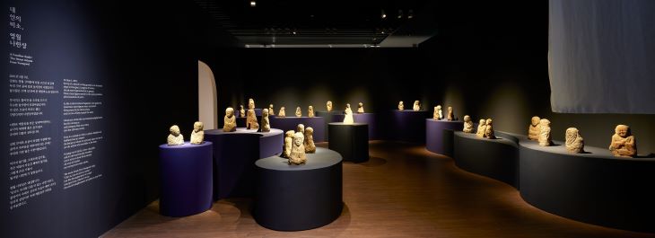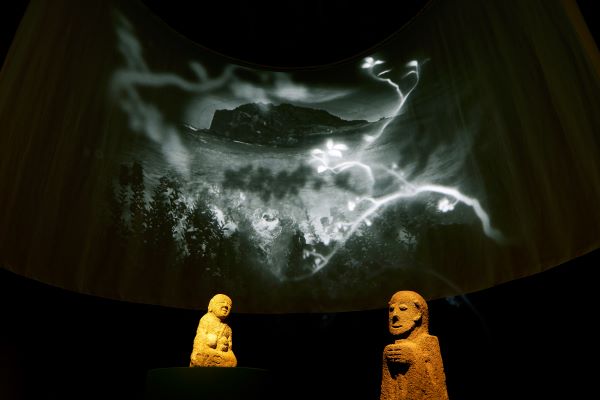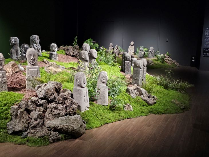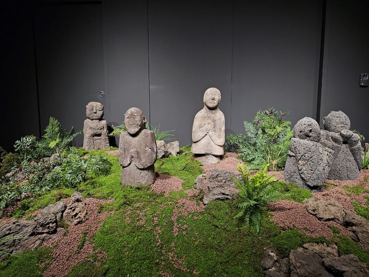 국립제주박물관이 지난 13일부터 기획전시실에서 특별전 '가장 가까운 위로-제주 동자석, 그리고 영월 나한상'을 선보이고 있다. 1부 공간인 '내 곁의 위로, 제주 동자석'은 관람객들이 본래의 자리에 놓인 동자석을 만나는 경험을 제공하기 위해 오름을 형상화한 구조물에 고사리와 엉겅퀴 등 제주의 식물을 연출했다. 오은지기자
