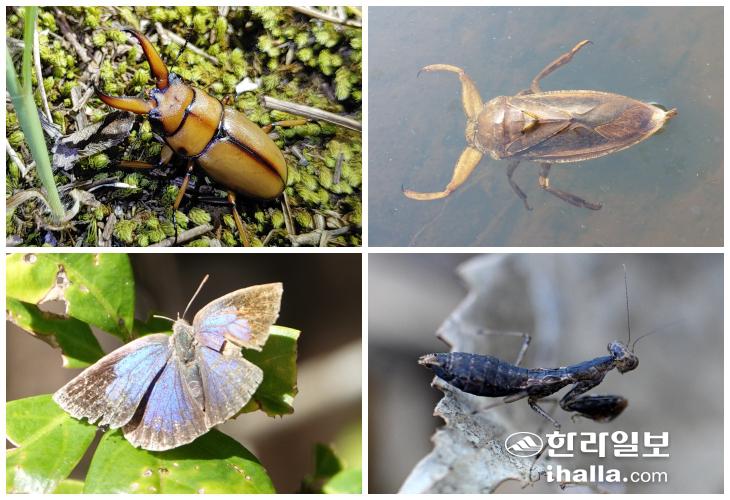 사진 맨 위 왼쪽부터 시계 방향으로 두점박이사슴벌레, 물장군, 좁쌀사마귀, 남방남색부전나미. 사진=국립산림과학원