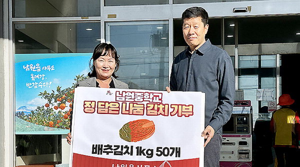 남원중학교(교장 안성의)는 지난 2일 서귀포시 남원읍(읍장 현은정)을 방문해 관내 어려운 가정에 전달해 달라며 학생들과 교직원들이 직접 담근 김치 50㎏를 기탁했다. 이날 전달한 김치는 지역내 독거노인·저소득층 등 취약계층에 전달됐다.