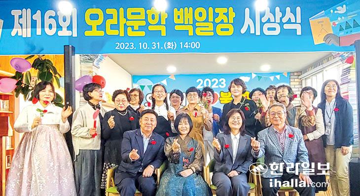 제주시 오라동(동장 장옥영) 책 읽는주부들의모임(오라의 꿈 회장 문명숙)은 지난달 31일 '제16회 오라문학백일장 시상식'과 '오라의 꿈♡북 콘서트'를 오라공설책마을에서 성황리에 개최했다.