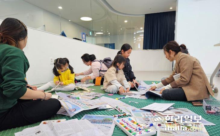 12일 별이 내리는 숲(3·4층)에서 진행된 '2023 JDC와 함께하는 미디어 체험데이'에서 부모와 자녀가 함께 '신문 기사로 그림책을 만들어요' 체험 프로그램에 참여하고 있다. 오은지기자