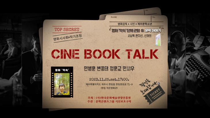 사단법인 한국문화예술관광진흥원 주최, '문학콘텐츠그룹 시인보호구역'(상임대표 정훈교) 주관으로 이달 25일 오후 5시 제주시 한림읍 소재 한림작은영화관에서 열리는 '씨네북토크 in JEJU'를 통해서다.