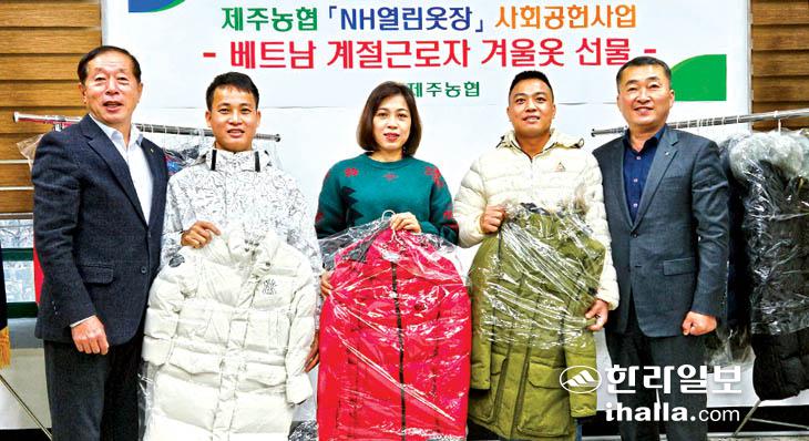 제주농협(본부장 윤재춘)은 'NH열린옷장' 사회공헌사업의 일환으로 지난 27일 서귀포시 위미농협에서 공공형계절근로자(베트남 남딘성)에게 겨울점퍼, 외투 등 겨울의류 80여 점을 전달했다.