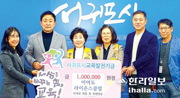 이어도라이온스클럽(회장 이복란)은 지난 28일 서귀포시청 접견실에서 (재)서귀포시교육발전기금(이사장 현봉식)에 서귀포시교육발전기금 100만 원을 기탁했다.