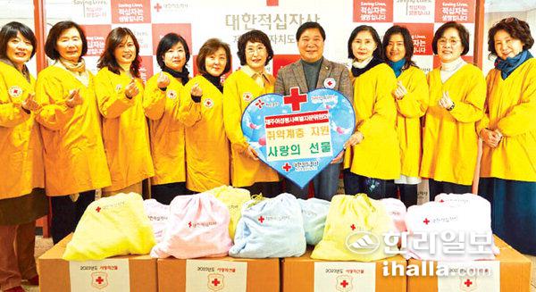 제주적십자여성봉사특별자문위원회(위원장 강현숙)는 지난 28일 대한적십자사제주특별자치도지사(회장 정태근)에게 '연말 이웃 돕기 2023 사랑의 선물' 70개를 전달했다.
