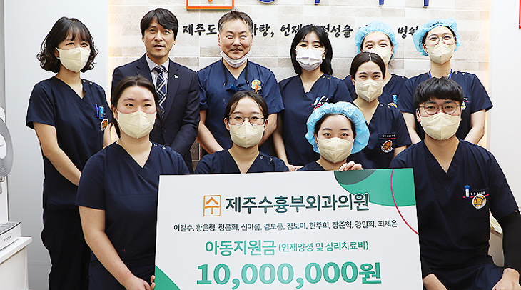 이날 전달된 후원금은 제주수흉부외과 임직원이 함께 지역 내 도움이 필요한 아동들을 지원하기 위해 마련한 것으로, 인재양성비와 아동 심리치료비로 사용될 예정이다.