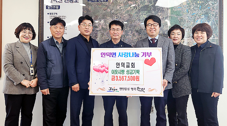 서귀포시 안덕면 대한예수장로회 안덕교회(목사 손범수)는 지난 7일 안덕면사무소를 방문해 안덕면 어려운 이웃을 위해 사용해 달라며 서귀포시서부종합사회복지관에 성금 356만7500원을 기탁했다.