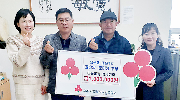 서귀포시 남원읍 태흥1리에 거주하는 고승일·문미정 부부는 지난 7일 관내 어려운 이웃을 돕는 데 사용해 달라며 성금 100만 원을 남원읍(읍장 현은정)에 기탁했다.
