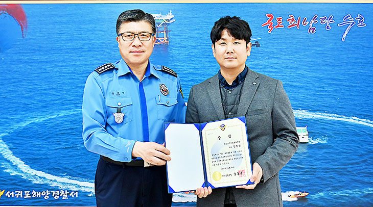 서귀포해양경찰서(서장 윤태연)는 14일 서귀포해양경찰서 청사에서 올해의 우수 명예해양환경감시원으로 선정된 강범정씨에게 감사장을 수여했다.