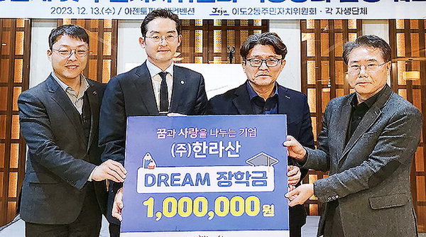 (주)한라산은 지난 13일 이도2동 주민자치위원회가 주최·주관하는 '행복한 지역공동체 활성화를 위한 자생 단체 및 주민자치위원회 역량 강화 합동 워크숍'에서 우수 장학생에게 '드림장학금' 100만원을 전달했다.