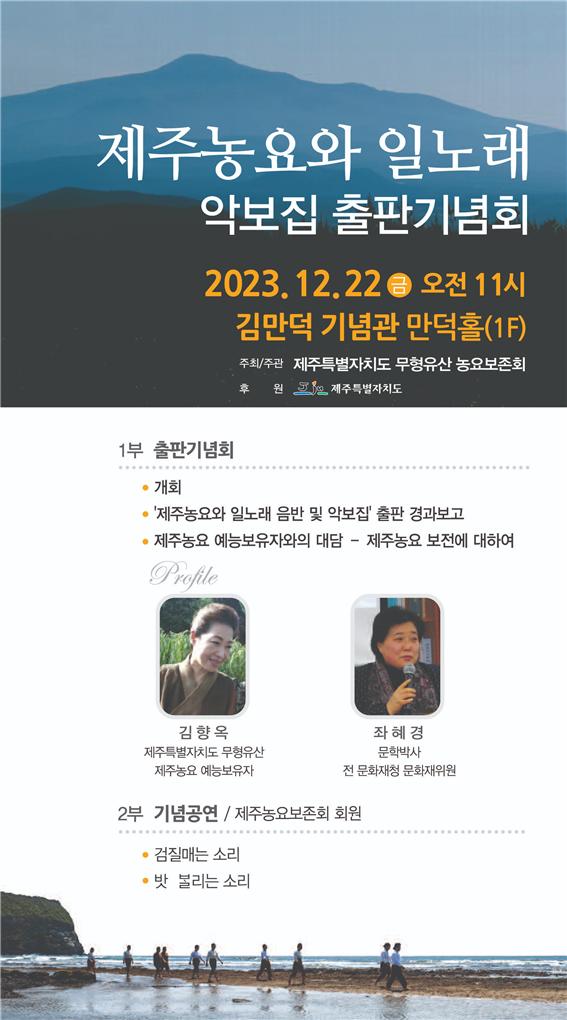출판기념회는 출판 경과보고 및 예능보유자와의 대담(제주농요 보전에 대하여)이 진행될 1부에 이어 제주농요보존회 회원들이 준비한 2부 기념공연으로 꾸며진다.