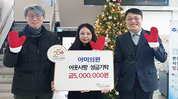 제주시 노형동 소재 아미의원(원장 송현정)은 최근 노형동주민센터(동장 김신엽)를 방문해 제주사회복지공동모금회(회장 강지언)를 통해 지원하는 이웃사랑 성금 500만원을 기탁했다.