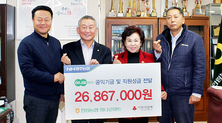한림농협(조합장 차성준)은 지난 22일 본점에서 도내 어려운 이웃을 돕는 데 써달라며 공익기금 2300만원과 임직원이 자발적으로 참여한 농촌 이웃사랑성금 380여 만원을 제주사회복지공동모금회에 기탁했다.