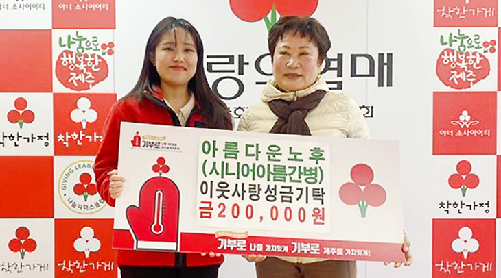 봉사단체 아름다운노후는 최근 제주사회복지공동모금회(회장 강지언)를 방문해 희망2024나눔캠페인 이웃사랑 성금 20만원을 기탁했다.