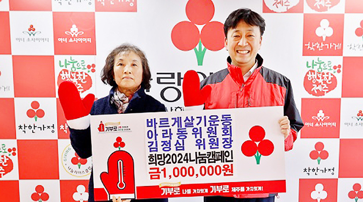 바르게살기운동 아라동위원회 김정심 위원장은 최근 제주사회복지공동모금회(회장 강지언) 사무실을 방문해 성금 100만원을 기탁했다.